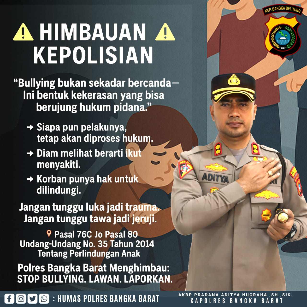 Kapolres Bangka Barat AKBP Pradana Aditya Nugraha, S.H., S.I.K., melalui PS. Kasi Humas Polres Bangka Barat Iptu Yos Sudarso, menegaskan bahwa bullying bukan sekadar tindakan iseng atau candaan, tetapi sudah masuk dalam kategori kekerasan yang berdampak serius secara psikologis bahkan fisik.