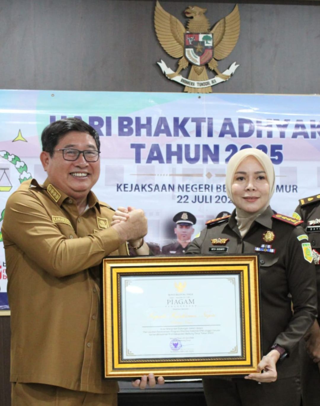 BELITUNG TIMUR, MB1 II Momen Hari Bhakti Adyaksa tahun 2025, Kepala Kejaksaan Negeri Belitung Timur (Beltim) Dr. Rita Susanti menerima penghargaan dari Bupati Beltim Kamarudin Muten di Kantor Kejari B...