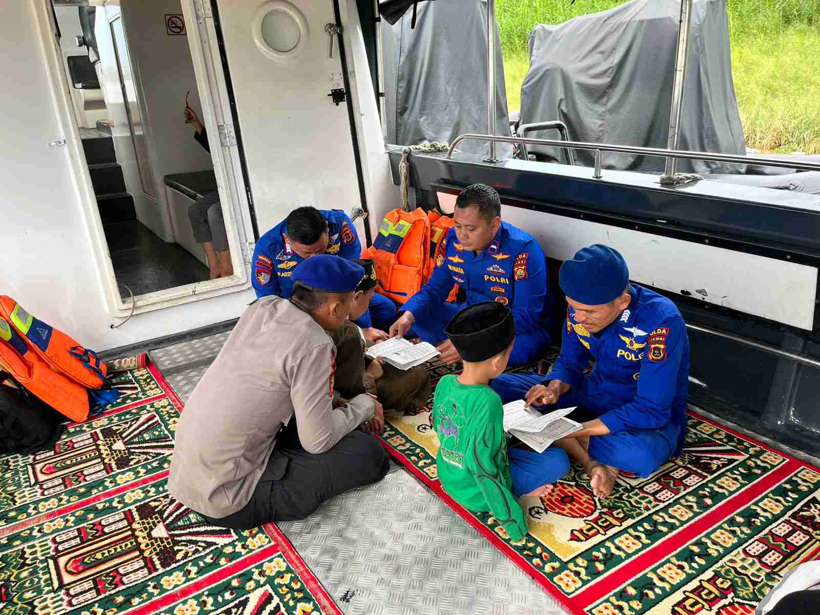 Kegiatan yang berlangsung di atas kapal Patroli KP. XXVI-2005 (LCT) ini dimulai pukul 16.00 WIB dengan agenda belajar mengaji bersama anak-anak Kelurahan Legok, Pulau Pandan Kota Jambi, Pembelajaran dipandu oleh ustadz Zulfahman dengan didampingi personel Ditpolairud Polda Jambi.