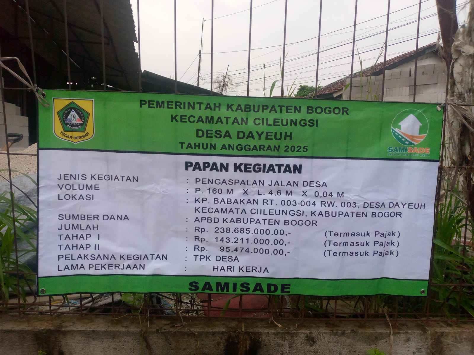 Kegiatan ini berupa pengaspalan jalan desa yang berlokasi di Kampung Babakan RT 003-004 RW 003, Desa Dayeuh. Berdasarkan papan informasi kegiatan, volume pekerjaan tercatat sepanjang 160 meter, lebar 4,6 meter, dan ketebalan 0,04 meter. Proyek ini didanai sepenuhnya dari APBD Kabupaten Bogor dengan total anggaran Rp 238.685.000,- termasuk pajak. Dana tersebut dibagi ke dalam dua tahap pencairan: