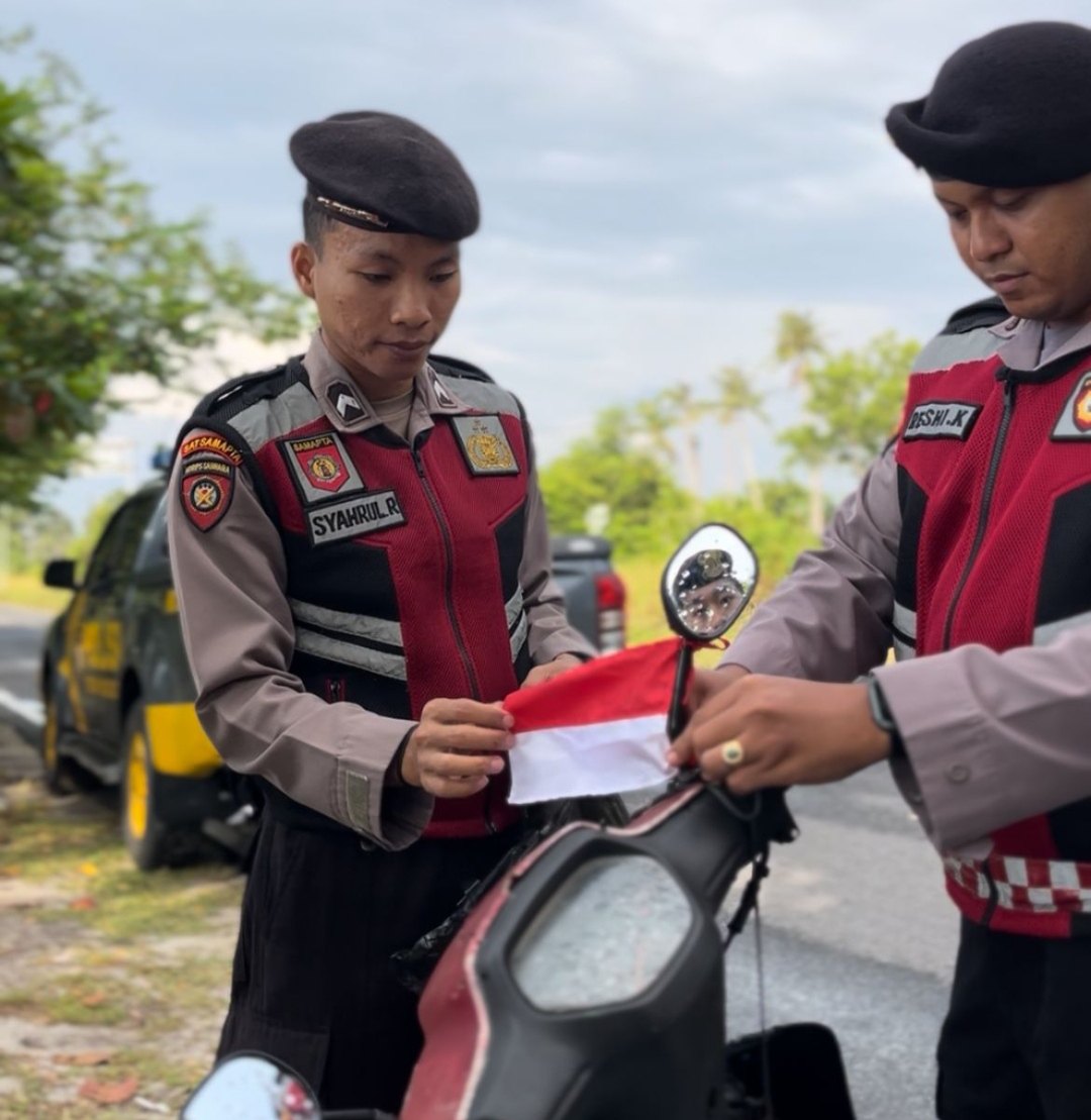 BELITUNG, MB1 II Dalam rangka memperingati Hari Kemerdekaan Republik Indonesia ke 80, Sat Samapta Polres Belitung melaksanakan kegiatan pembagian sekaligus pemasangan Bendera Merah Putih kepada masyarakat di wilayah Kecamatan Sijuk, Kabupaten Belitung, Kamis (14/08/2025).
