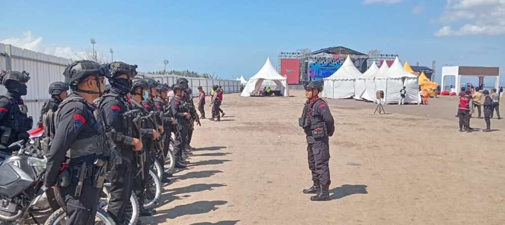GIANYAR, MB1 II Satuan Brimob Polda Bali turut serta dalam pengamanan Merdeka Festival yang berlangsung di BU Trening Center, Gianyar. Kegiatan pengamanan dipimpin oleh AKP I Made Budiartana selaku Komandan Kompi 1 Batalyon A Pelopor Satbrimobda Bali, yang bertugas sebagai Komandan Anti Anarkis.