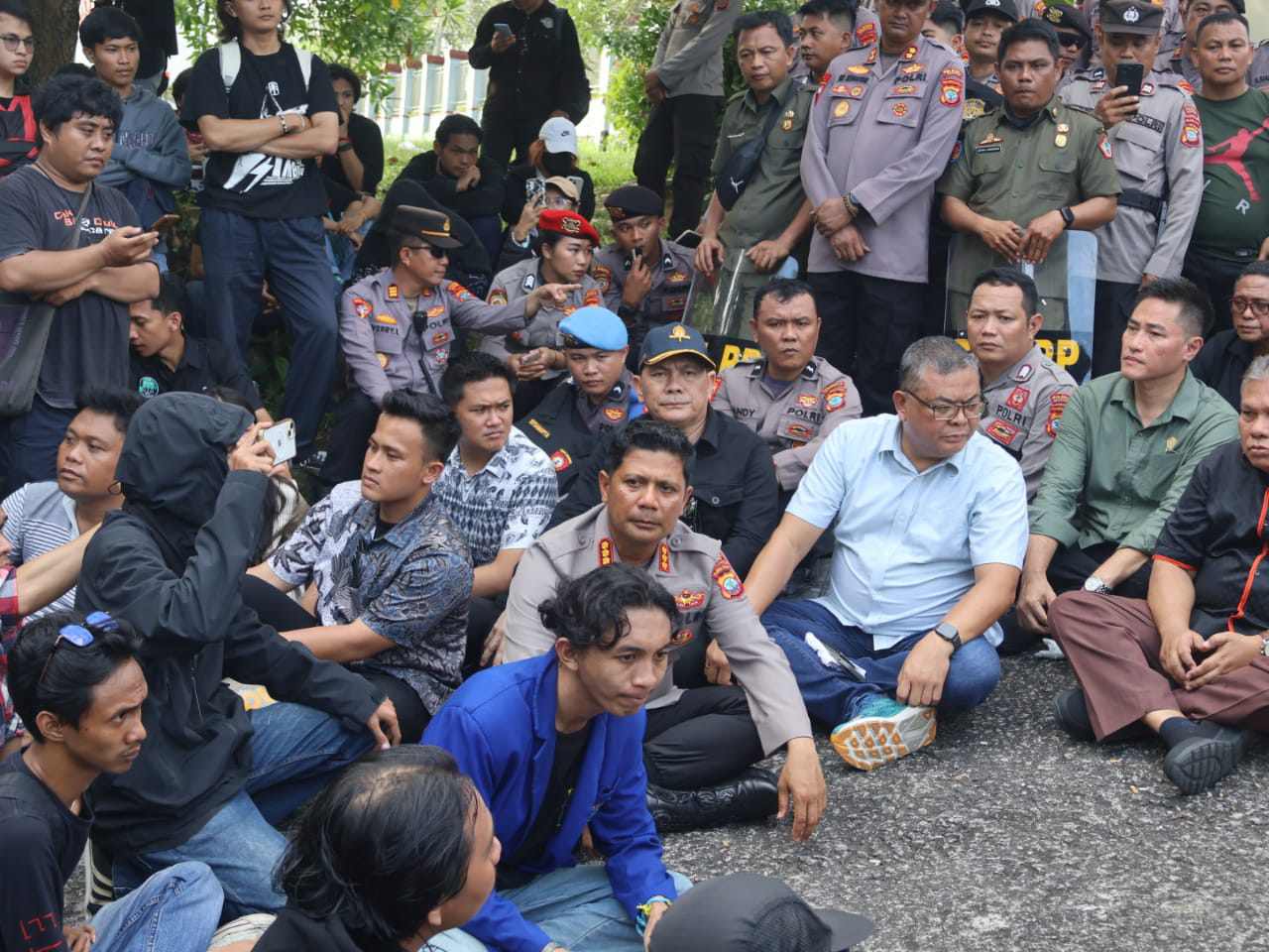 Pimpinan dan Anggota DPRD Provinsi Sulut pun menemui para pengunjuk rasa, selanjutnya mereka duduk bersama di jalan sambil berdialog terbuka terkait aspirasi yang disampaikan.