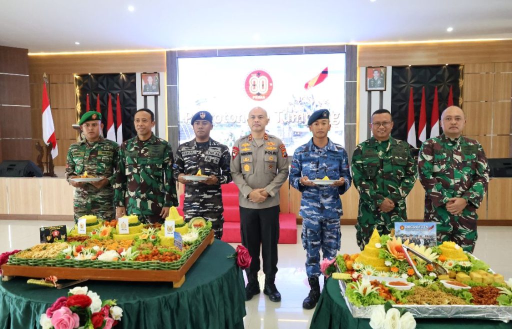 Tak hanya itu, Kapolda juga turut memotong nasi tumpeng untuk selanjutnya diberikan kepada perwakilan Prajurit dari 3 Matra TNI yakni AD, AL, maupun AU.