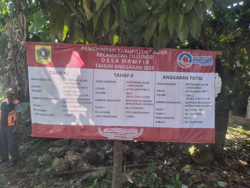 Total anggaran pembangunan jalan lingkungan ini mencapai Rp 290.670.000, bersumber dari Bantuan Keuangan Infrastruktur Desa Kabupaten Bogor Tahun 2025.