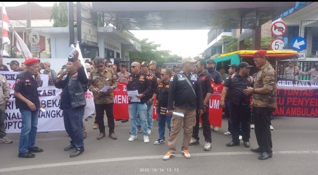 KOTA BEKASI, MB1 II Organisasi Masyarakat (Ormas) Gerakan Rakyat Indonesia Bersatu (GRIB) Jaya Kota Bekasi, melakukan aksi damai, didepan gedung Kejaksaan Negeri Kota Bekasi, Kamis, (16-10-2025).
