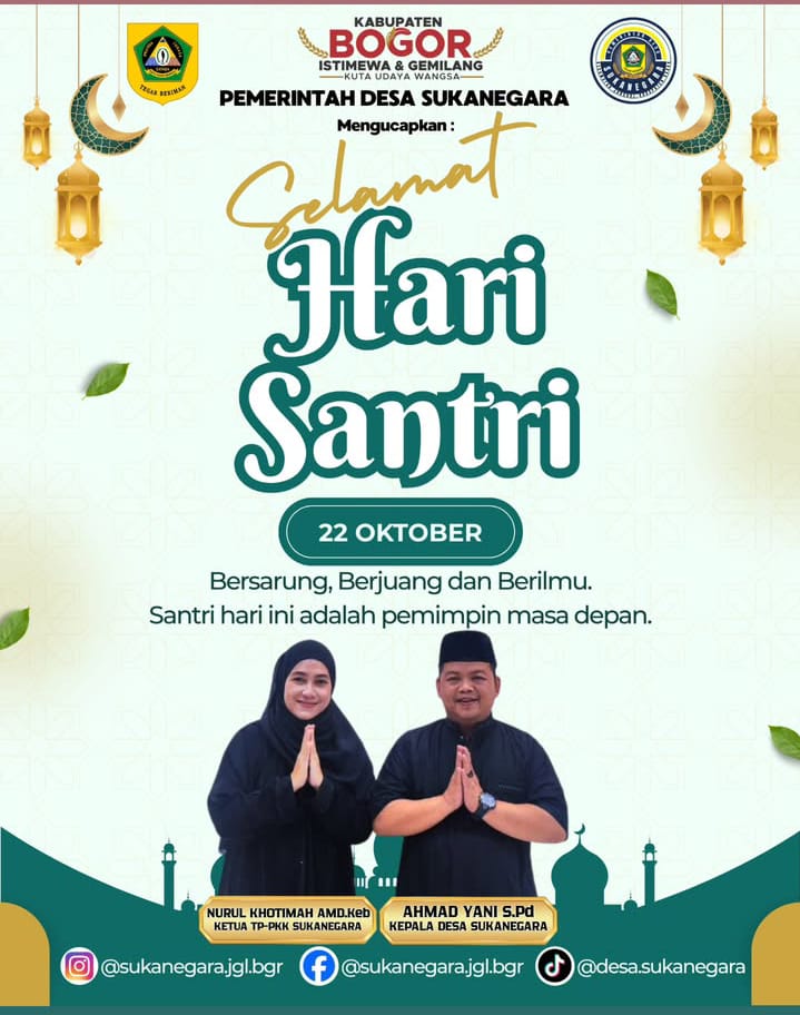 Kepala Desa Sukanegara sekaligus Ketua APDESI Kecamatan Jonggol, Ahmad Yani, S.Pd, bersama Ketua TP PKK Desa Sukanegara Nurul Khotimah, A.Md.Keb, mengucapkan selamat Hari Santri Nasional kepada seluruh santri di Indonesia, khususnya yang berada di wilayah Kecamatan Jonggol.