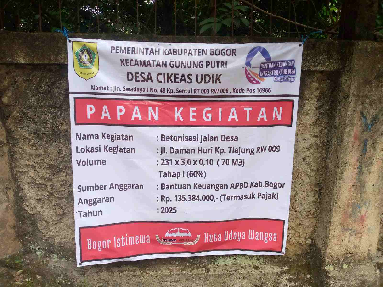 Pembangunan ini dilaksanakan melalui program Bantuan Keuangan Infrastruktur Desa (Bankeu Desa) dari APBD Kabupaten Bogor Tahun Anggaran 2025, dengan total anggaran sebesar Rp 135.384.000,- (termasuk pajak). Adapun volume pekerjaan mencapai P 231 M x L 3,0 M x T 0,10 M (70 m³) yang dikerjakan pada Tahap I (60%).