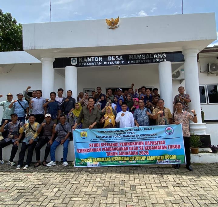 CITEUREUP – BOGOR, MB1 II Kepala Desa Hambalang, Wawang Sudarwan, menerima kunjungan rombongan dari Badan Kerjasama Antar Desa (BKAD) “Gemah Ripah” Kecamatan Toroh, Kabupaten Grobogan, dalam rangka kegiatan Studi Referensi Peningkatan Kapasitas Perencanaan Pembangunan Desa Tahun Anggaran 2026, Pada Jum’at (21/11/2025).