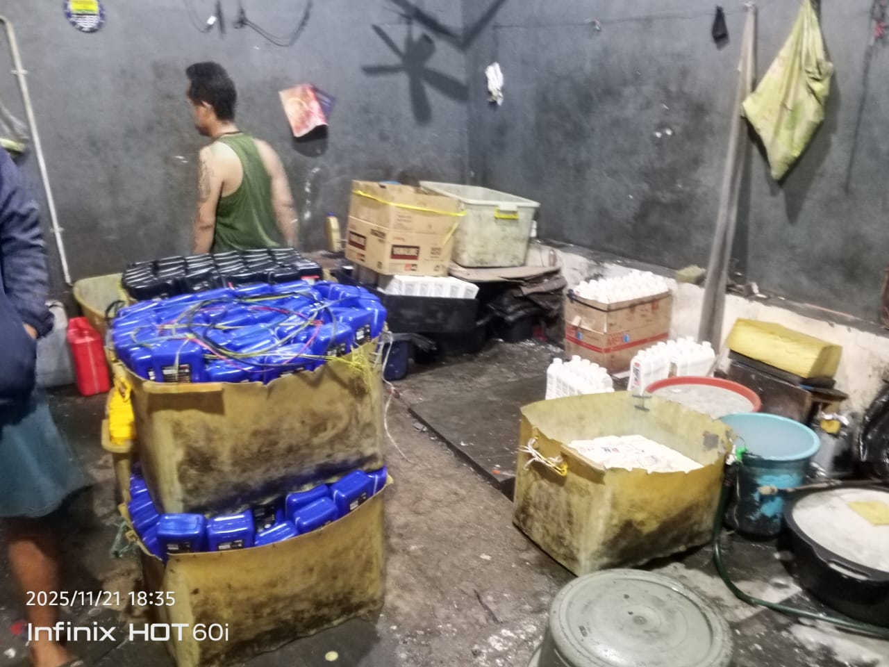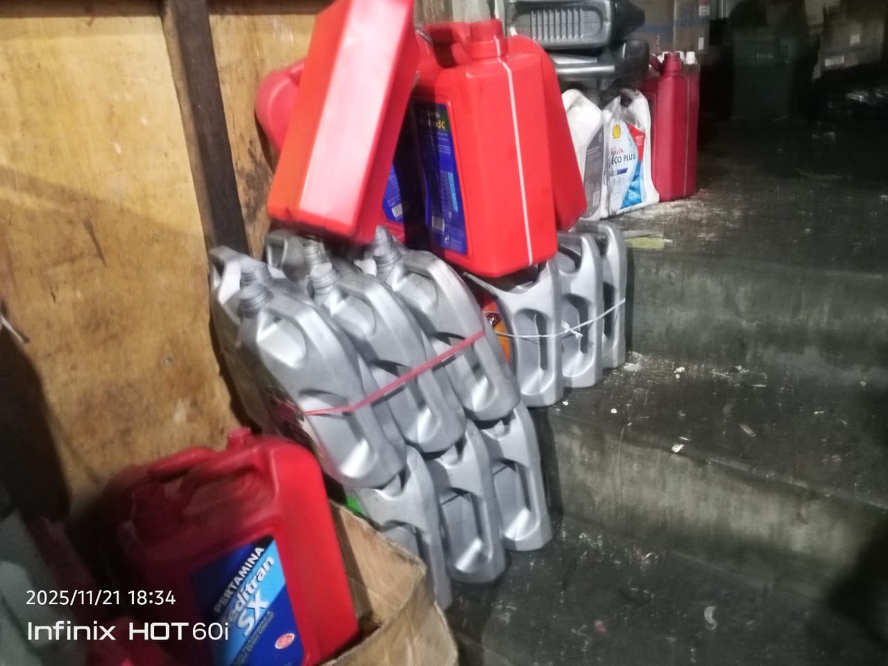 Di lokasi ditemukan tumpukan botol bekas berbagai merek oli ternama. Beberapa di antaranya telah dicuci, dikeringkan, dan tampak seperti baru. Awak media juga menemukan kumpulan stiker label baru yang diduga akan ditempelkan menggantikan label asli yang sudah kusam atau rusak.