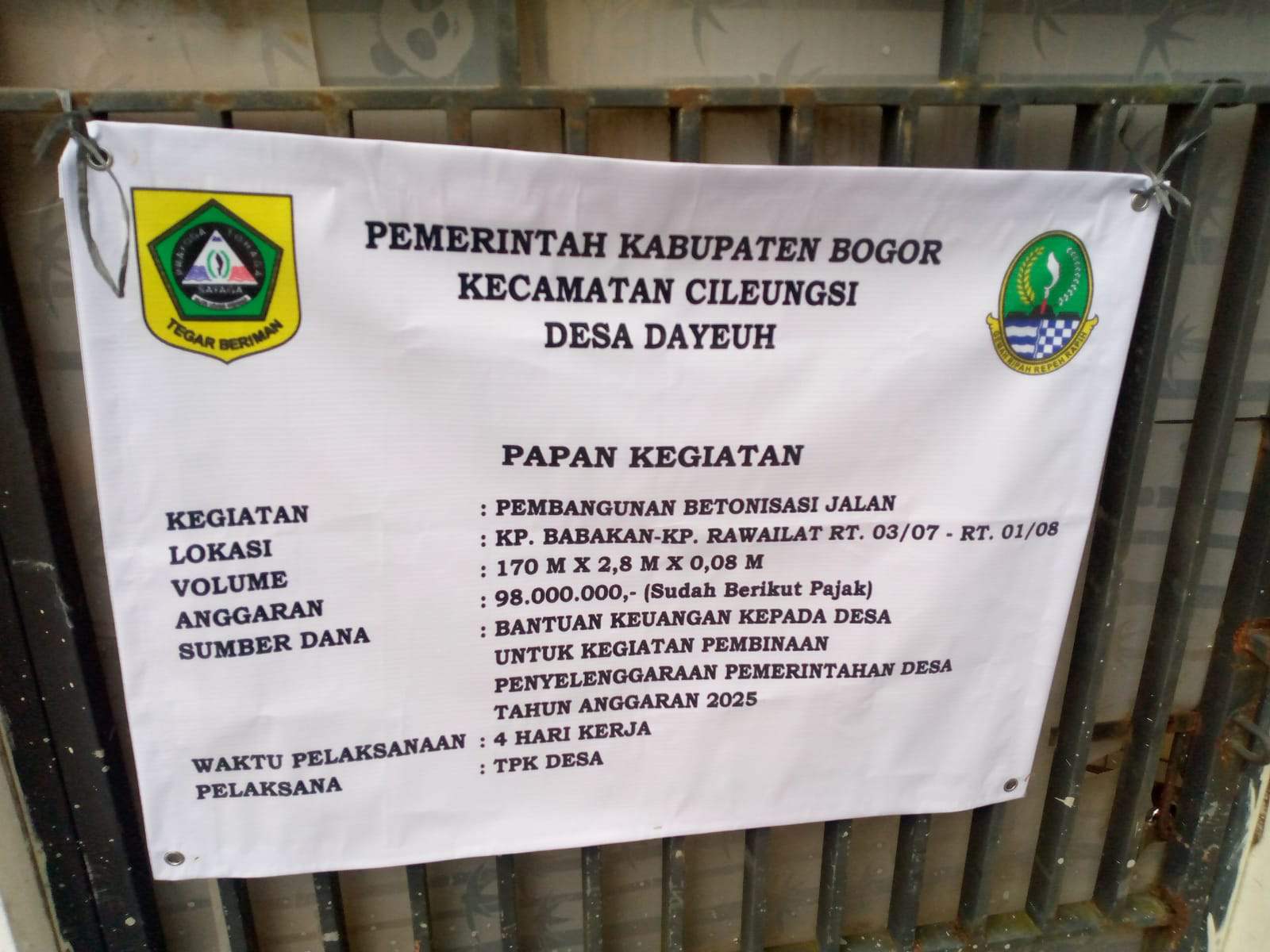 CILEUNGSI – BOGOR, MB1 II Pemerintah Desa Dayeuh, Kecamatan Cileungsi, Kabupaten Bogor, terus menunjukkan komitmennya dalam meningkatkan kualitas infrastruktur demi menunjang kemajuan wilayah serta kenyamanan masyarakat. Hal tersebut terealisasi melalui kegiatan pembangunan betonisasi jalan yang tengah dilaksanakan di wilayah Kampung Babakan – Kampung Rawailat, RT 03/07 sampai RT 01/08, sebagaimana tertera dalam papan informasi kegiatan yang terpasang di lokasi.