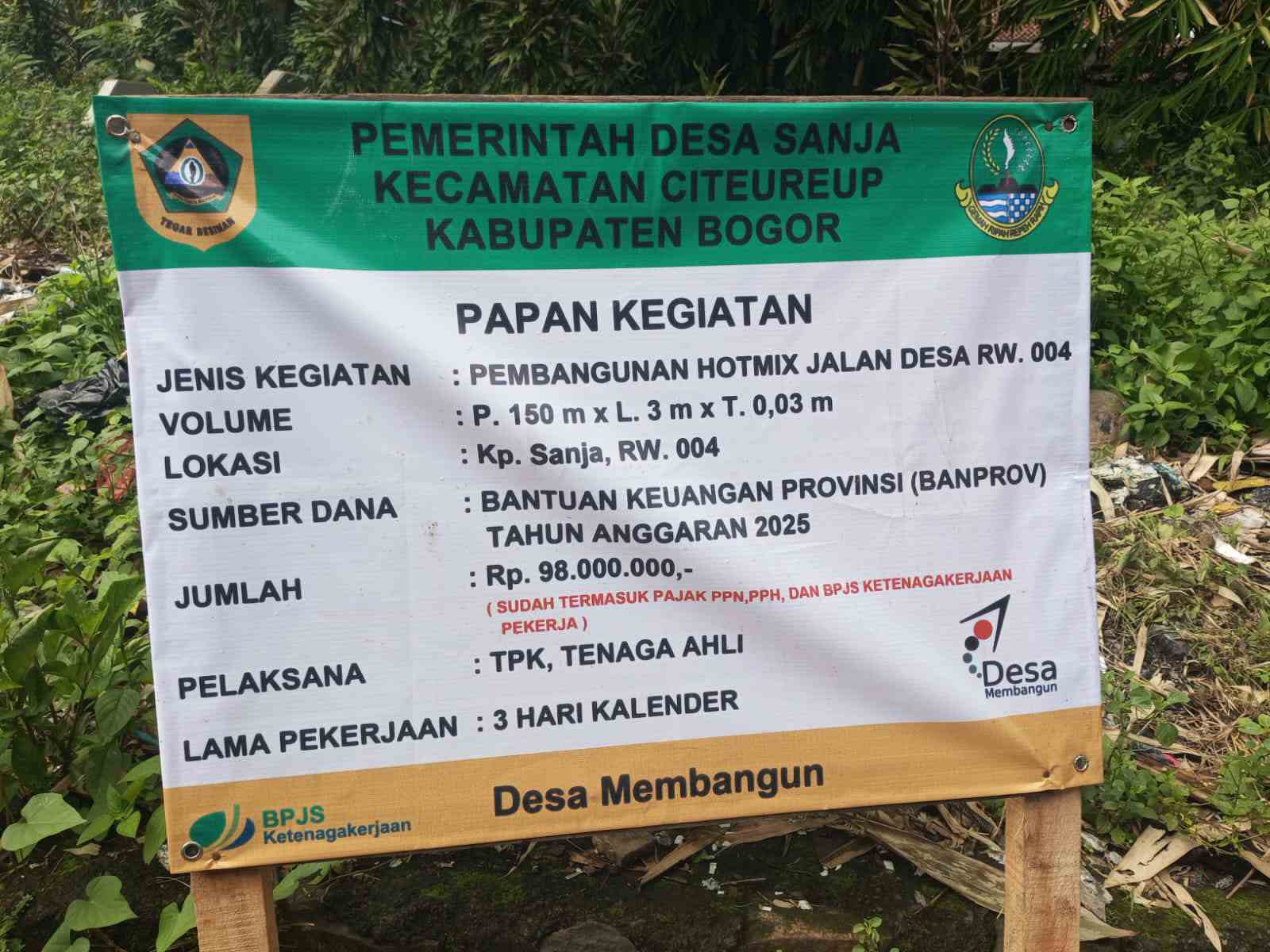 Berdasarkan papan informasi kegiatan, pembangunan hotmix jalan desa ini memiliki volume pekerjaan P 150 M x L 3 M x T 0,03 M. Kegiatan tersebut berlokasi di Kampung Sanja RW 004 dan bersumber dari Bantuan Keuangan Provinsi (Banprov) Tahun Anggaran 2025 dengan total anggaran sebesar Rp 98.000.000, yang sudah termasuk pajak PPN, PPh.