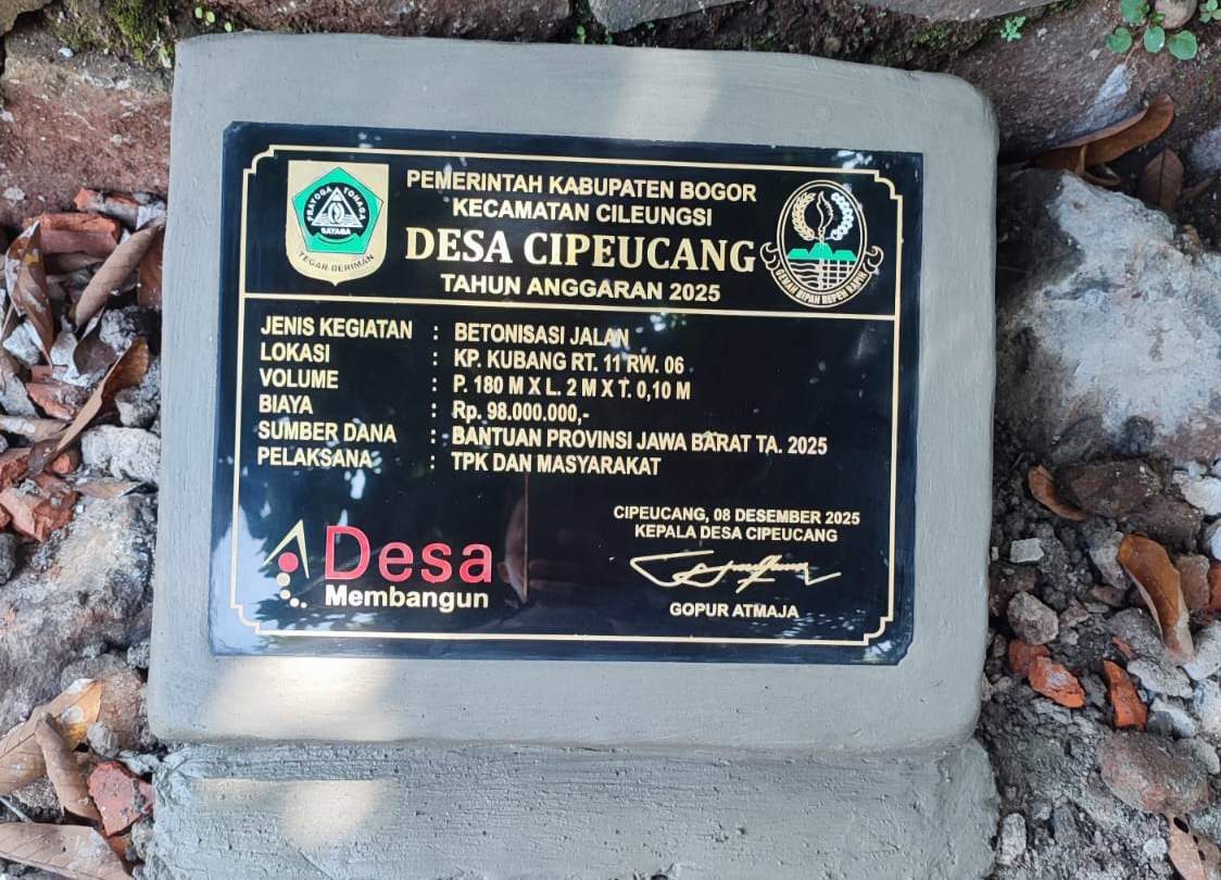 CILEUNGSI – BOGOR, MB1 II Pemerintah Desa Cipeucang, Kecamatan Cileungsi, Kabupaten Bogor, terus berkomitmen meningkatkan kualitas infrastruktur desa melalui pelaksanaan pembangunan rabat beton yang bersumber dari Bantuan Keuangan (Bankeu) Provinsi Jawa Barat Tahun Anggaran 2025.