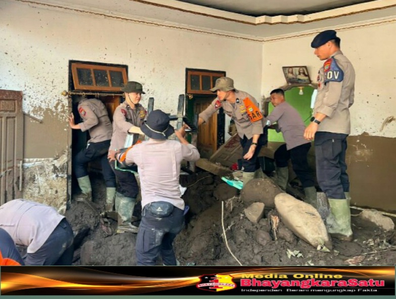 Personel juga melakukan korvey kerja bakti membersihkan rumah-rumah warga yang masih penuh dengan lumpur dan sampah akibat banjir bandang beberapa hari lalu.