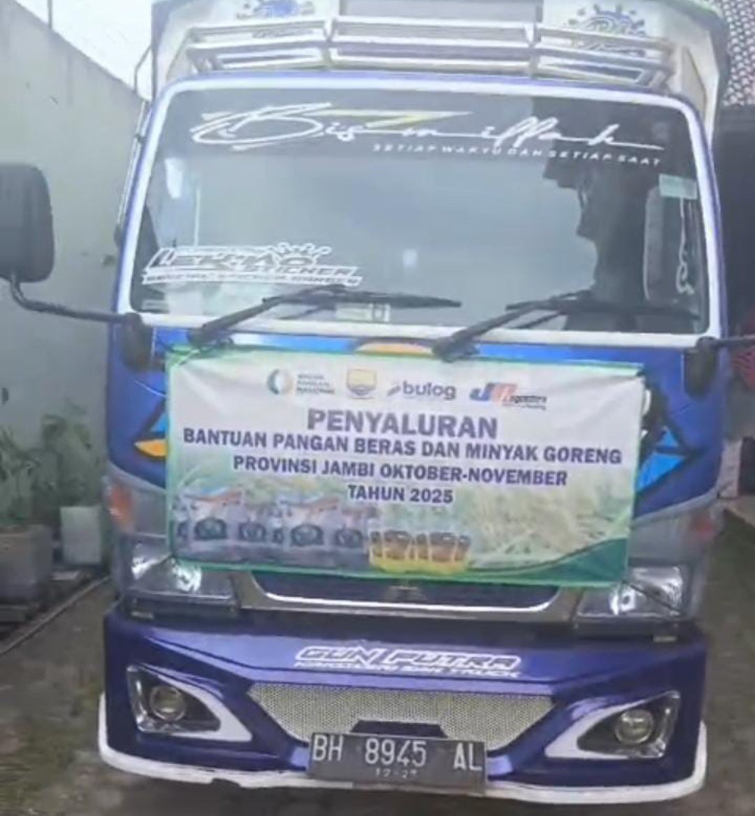 Anehnya, truk pengangkut minyak goreng tersebut terdapat spanduk bertuliskan “Penyaluran Bantuan Pangan Beras dan Minyak Goreng Provinsi Jambi Oktober-November Tahun 2025.