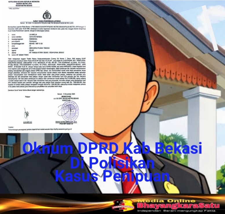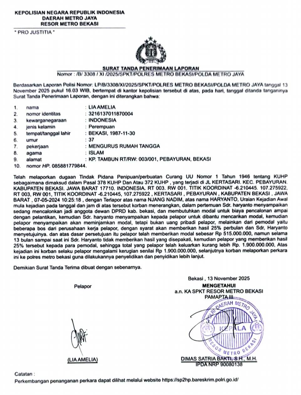 Korban penipuan dan penggelapan, LA (37) melaporkan Haryanto dan ajudannya, Njang Nadim, ke Polres Metro Bekasi berdasarkan dengan nomor : LP/B/3308/XI/2025/SPKT/Polres Metro Bekasi pada Kamis (13/11/25).