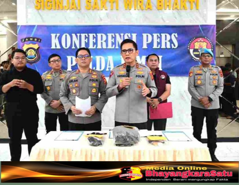 JAMBI, MB1 // Kepolisian Daerah Jambi menggelar konferensi pers terkait keberhasilan pengungkapan dan penangkapan Daftar Pencarian Orang (DPO) kasus peredaran gelap narkotika, Kamis (16/4/2026). Kegiatan yang berlangsung di Lobby Utama Gedung Mapolda Jambi tersebut dipimpin langsung oleh Kapolda Jambi Irjen Pol. Krisno H. Siregar, didampingi Wakapolda Jambi Brigjen Pol. B. Ali serta Kabid Humas Polda Jambi Kombes Pol. Erlan Munaji, Dir Resnarkoba Polda Jambi Kombes Pol. Dewa Made Palguna, Kabid Propam Polda Jambi Kombes Pol. Darno.