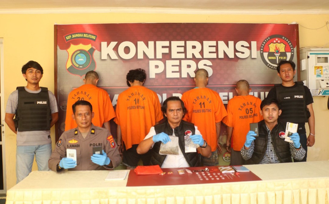 BELITUNG, MB1 II Satresnarkoba Polres Belitung menggelar kegiatan press release terkait keberhasilan pengungkapan kasus tindak pidana narkotika yang melibatkan empat tersangka, dengan barang bukti nar...