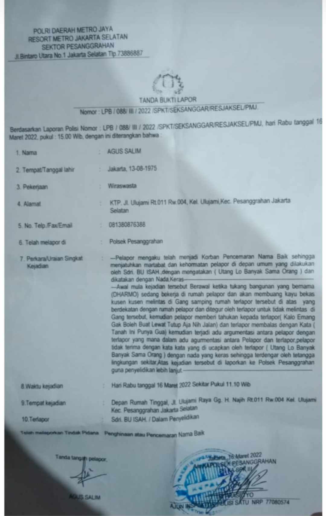 ULUJAMI – PESANGGRAHAN – JAKSEL – MB1 || Agus Salim (48) warga Ulujami RT.011, RW. 004 Kelurahan Ulujami, Kecamatan Pesanggrahan Jakarta Selatan lapor polisi lantaran nama baiknya me...