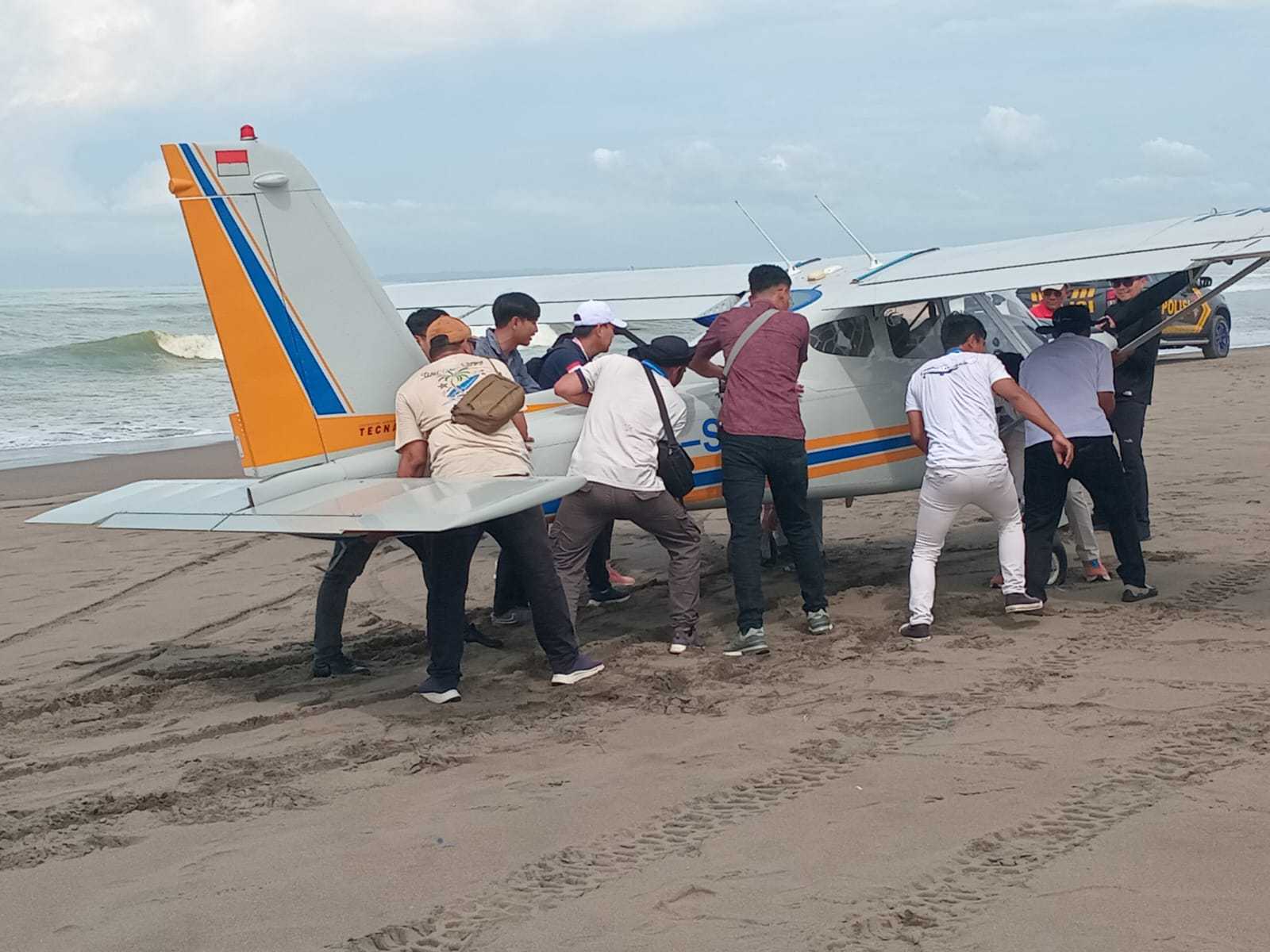 PANGANDARAN – JABAR, MB1 II Pesawat jenis capung mendarat darurat di pesisir pantai sebelah Barat kawasan Kampung Turis Pangandaran pada, Minggu 20 April 2025. Kabid Humas Polda Jabar Kombes Pol...