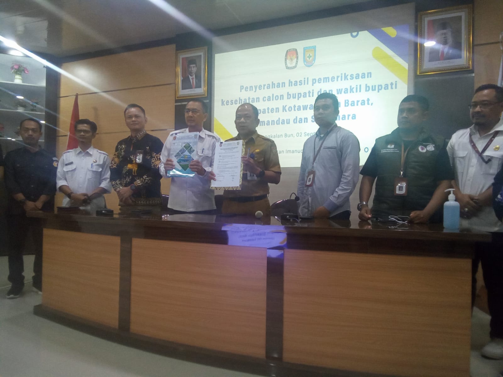 KOTAWARINGIN BARAT – KALTENG, MB1 II Fachruddin derektur RSUD Kotawaringin Barat menyerahkan hasil pemeriksaan kesehatan bakal calon Bupati Kotawaringin Barat,calon Bupati Lamandau dan calon Bup...