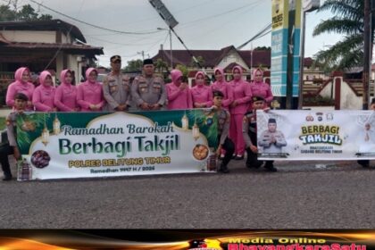 BELITUNG TIMUR, MB1 II Polres Belitung Timur bagi-bagi takjil kepada pengguna jalan raya Manggar Gantung, Kamis (26/02/2026). Bagi-bagi takjil ini di pimpin langsung Kapolres Belitung Timur, AKBP Indr...