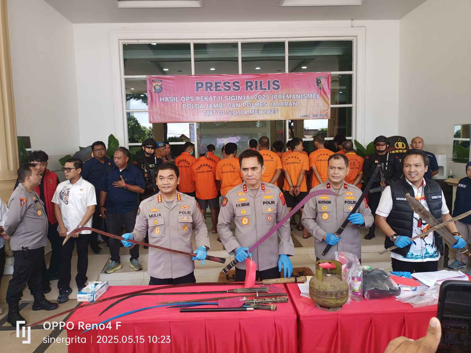 JAMBI, MB1 II Polisian Daerah (Polda ) Jambi melaksanakan konferensi pers terkait hasil OPS Pekat II Siginjai 2025 terkait Premanisme oleh Polda Jambi dan Polres Jajaran TMT 01-14 Mei 2025 di Loby Map...
