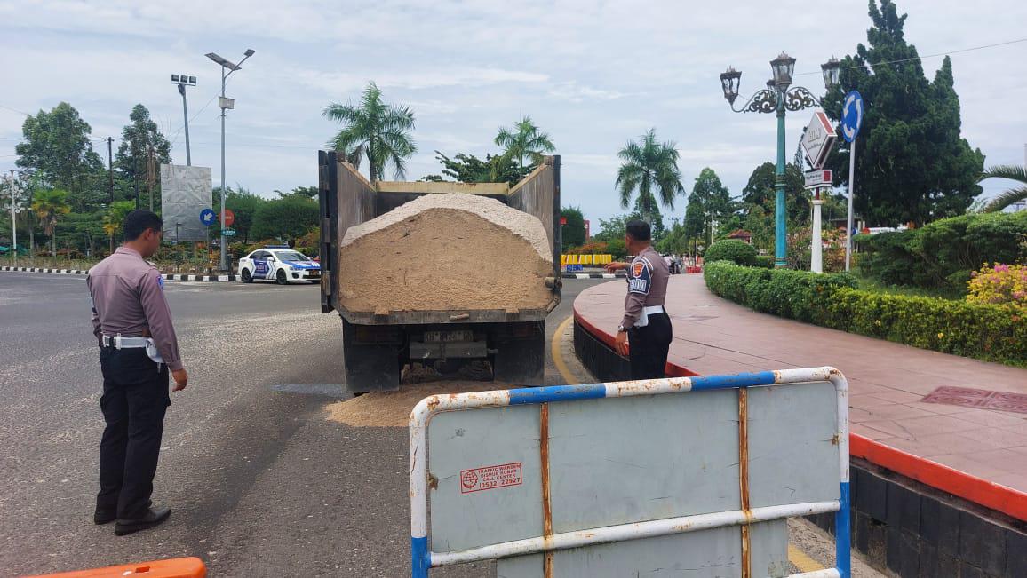 KOTAWARINGIN BARAT – KALTENG, MB1 II Polres Kotawaringin Barat – Anggota Sat Lantas Polres Kobar bergerak cepat menutupi tumpahan solar dijalan yang berada sekitar Bundaran Pancasila, Sabt...