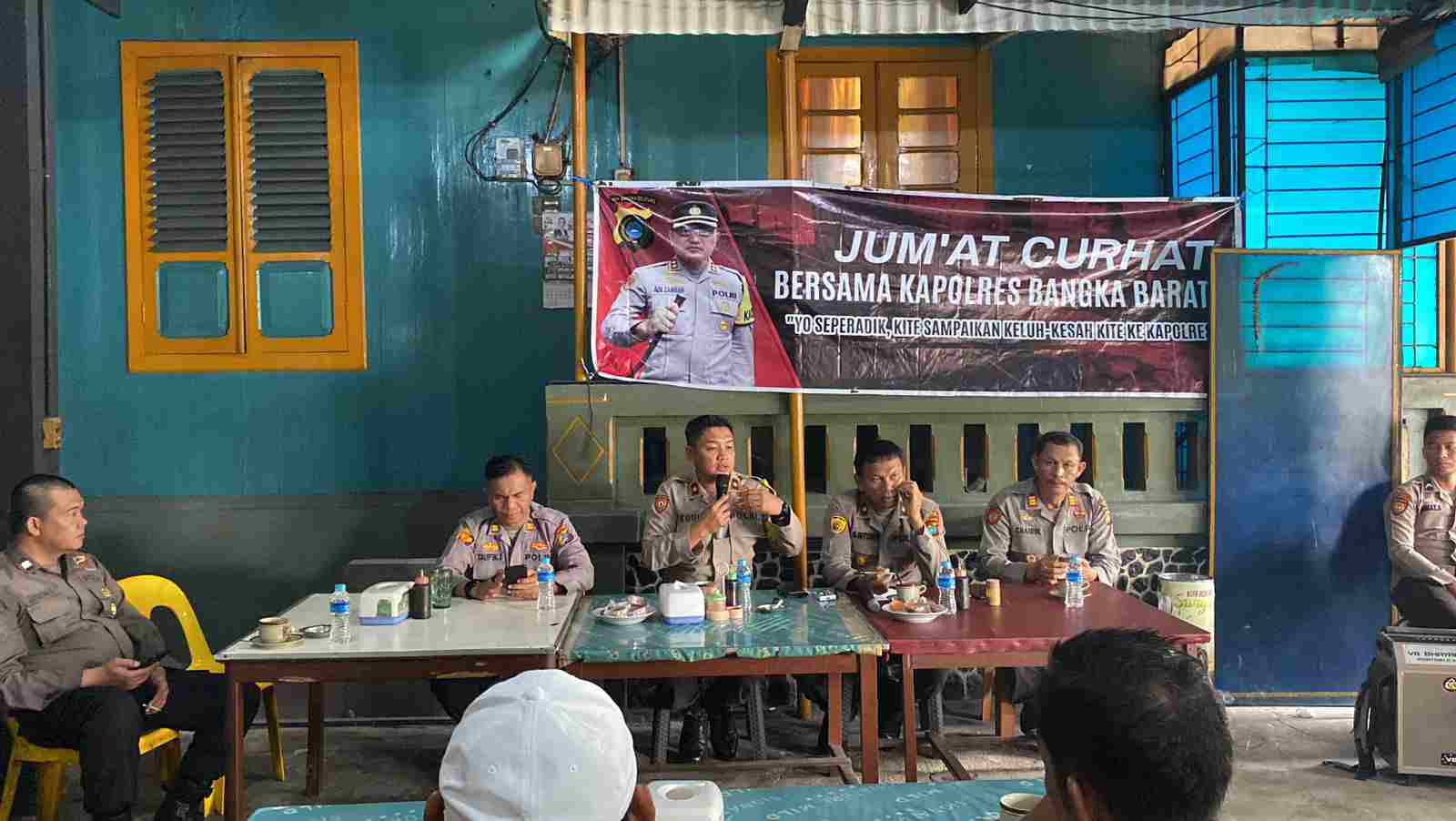 BANGKA BARAT – MB1 II Wakapolres Bangka Barat Kompol Imam Teguh Prasetyo mendengarkan aspirasi masyarakat melalui program ‘Jumat Curhat’ di warung kopi bujang Kecamatan mentok Kabupaten Bangka B...