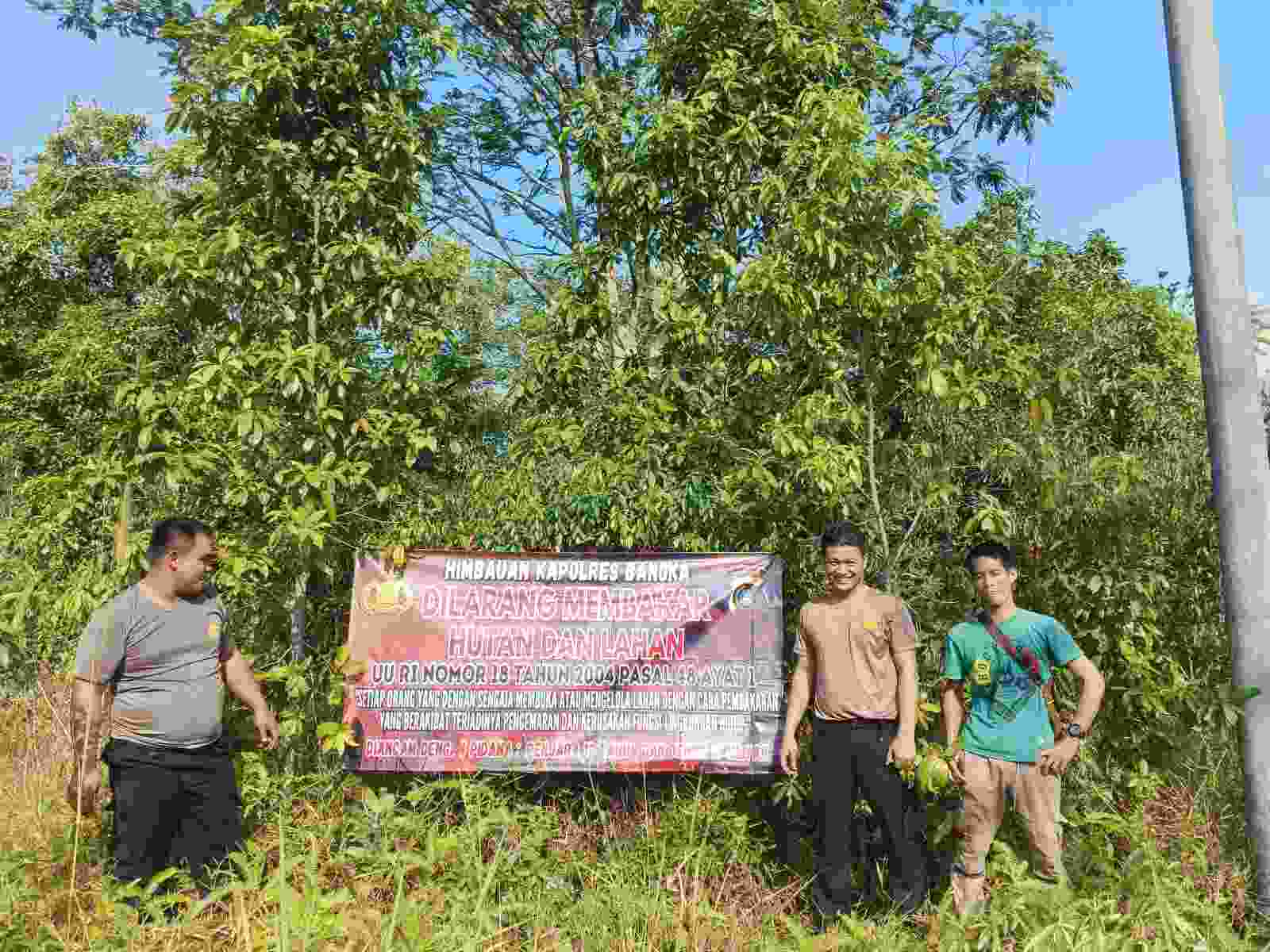 SUNGAILIAT – MB1 || Upaya Kepolisian mencegah dan mengantisipasi kebakaran hutan dan lahan dilakukan Polsek Mendo Barat denga memasang spanduk himbauan larangan Membakar Hutan dan Lahan (Karhutl...