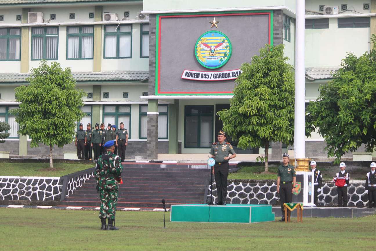 PANGKALPINANG, MB1 II Komandan Korem 045/Garuda Jaya Brigjen TNI Safta Feryansyah, S.E.,S.I.P.,M.Han., memimpin Upacara Bendera 17-an Bulan Maret Tahun 2025, bertempat di lapangan Upacara Makorem 045/...