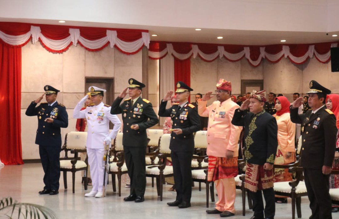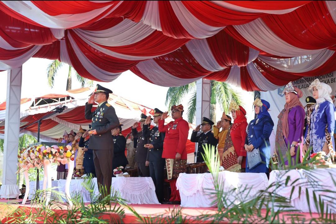 PANGKALPINANG, MB1 II Danrem 045/Gaya Brigjen TNI Safta Feryansyah S.E.,S.I.P.,M.Han beserta Ibu Ketua Persit KCK Koorcabrem 045 PD II/Swj menghadiri Upacara Peringatan HUT Kemerdekaan RI ke-79 di Hal...
