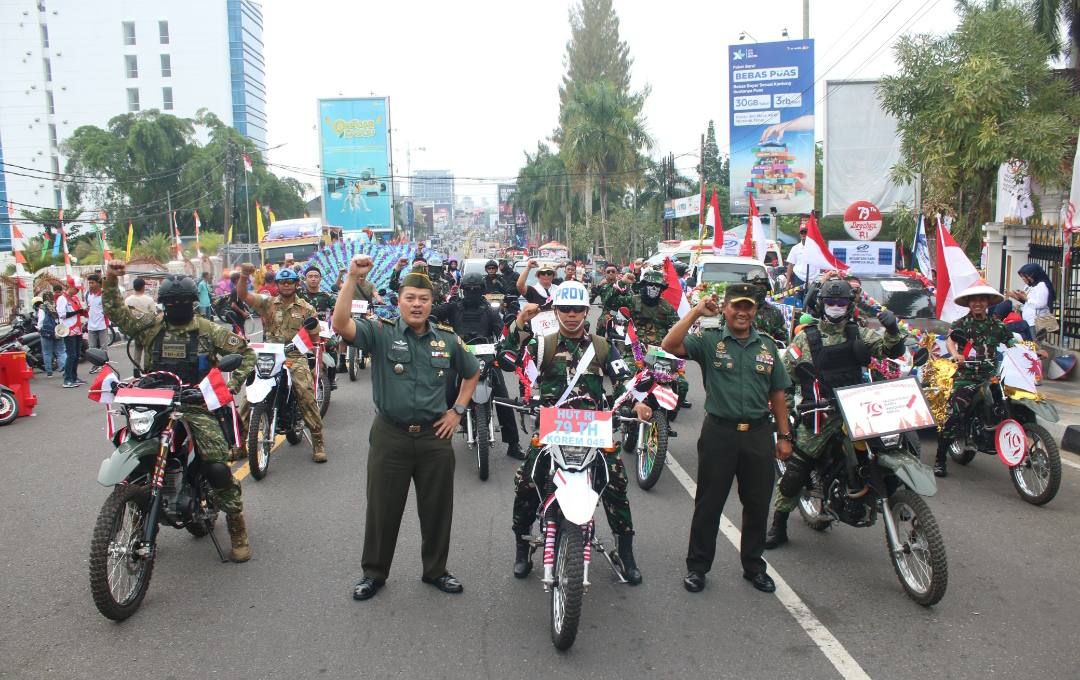 PANGKALPINANG, MB1 II Sebanyak 25 kendaraan dinas roda dua Korem 045/Gaya dan kendaraan dinas Yonif 147/KGJ ikut memeriahkan HUT RI Ke-79 Tahun 2024 yang diselenggarakan oleh Pemerintah Provinsi Kepul...