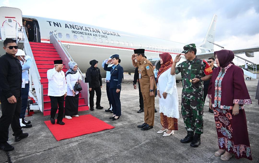 PANGKALPINANG, MB1 II Pangdam II/Sriwijaya Mayjen TNI M. Naudi Nurdika beserta Ny. Rika Naudi Nurdika menyambut kedatangan Wakil Presiden RI Prof. Dr. (H.C) K.H. Ma’ruf Amin beserta Ibu HJ. Wury Ma’ru...