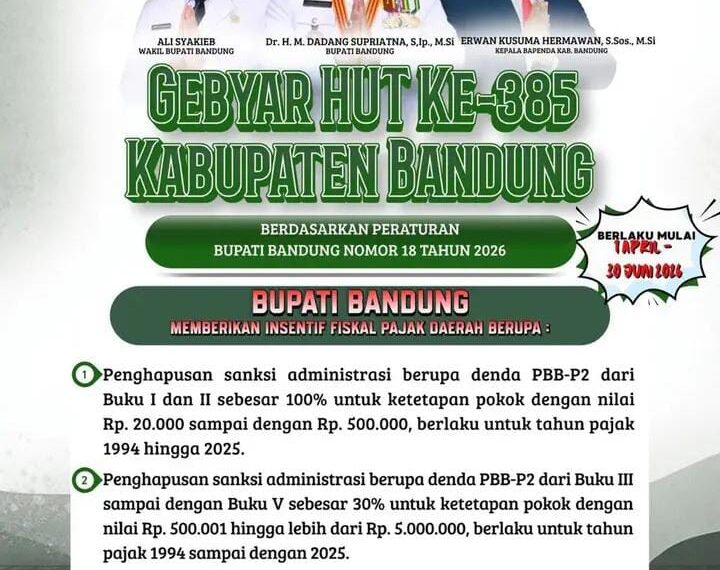 KABUPATEN BANDUNG, MB1 // Dalam rangka memperingati Hari Jadi Kabupaten Bandung ke-385, Badan Pendapatan Daerah (Bapenda) Kabupaten Bandung meluncurkan beberapa program insentif fiskal berupa penghapusan sanksi administratif atau denda pajak daerah h...