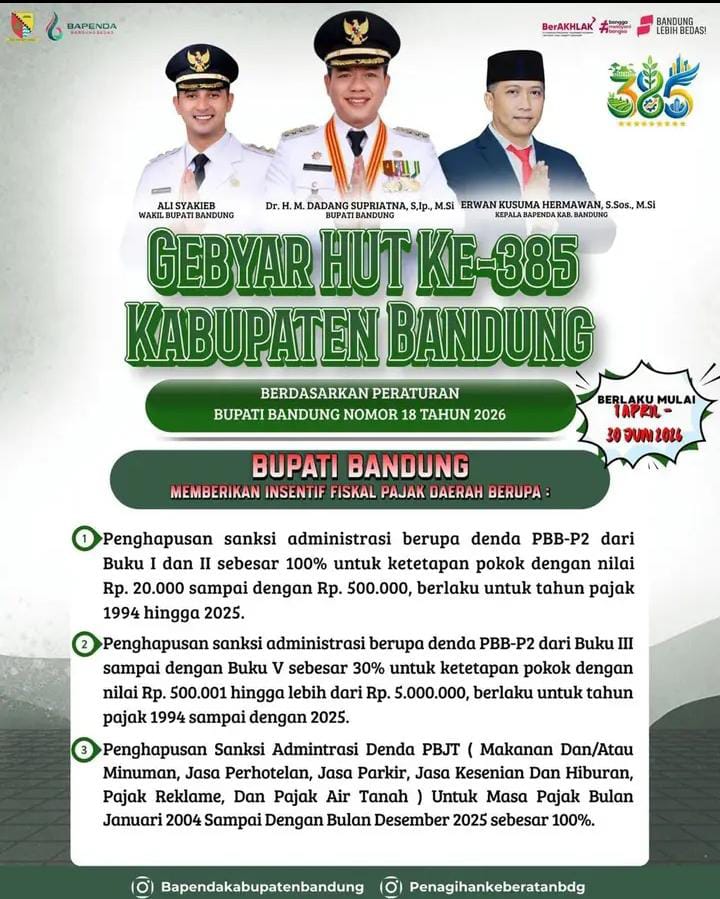 KABUPATEN BANDUNG, MB1 // Dalam rangka memperingati Hari Jadi Kabupaten Bandung ke-385, Badan Pendapatan Daerah (Bapenda) Kabupaten Bandung meluncurkan beberapa program insentif fiskal berupa penghapusan sanksi administratif atau ...
